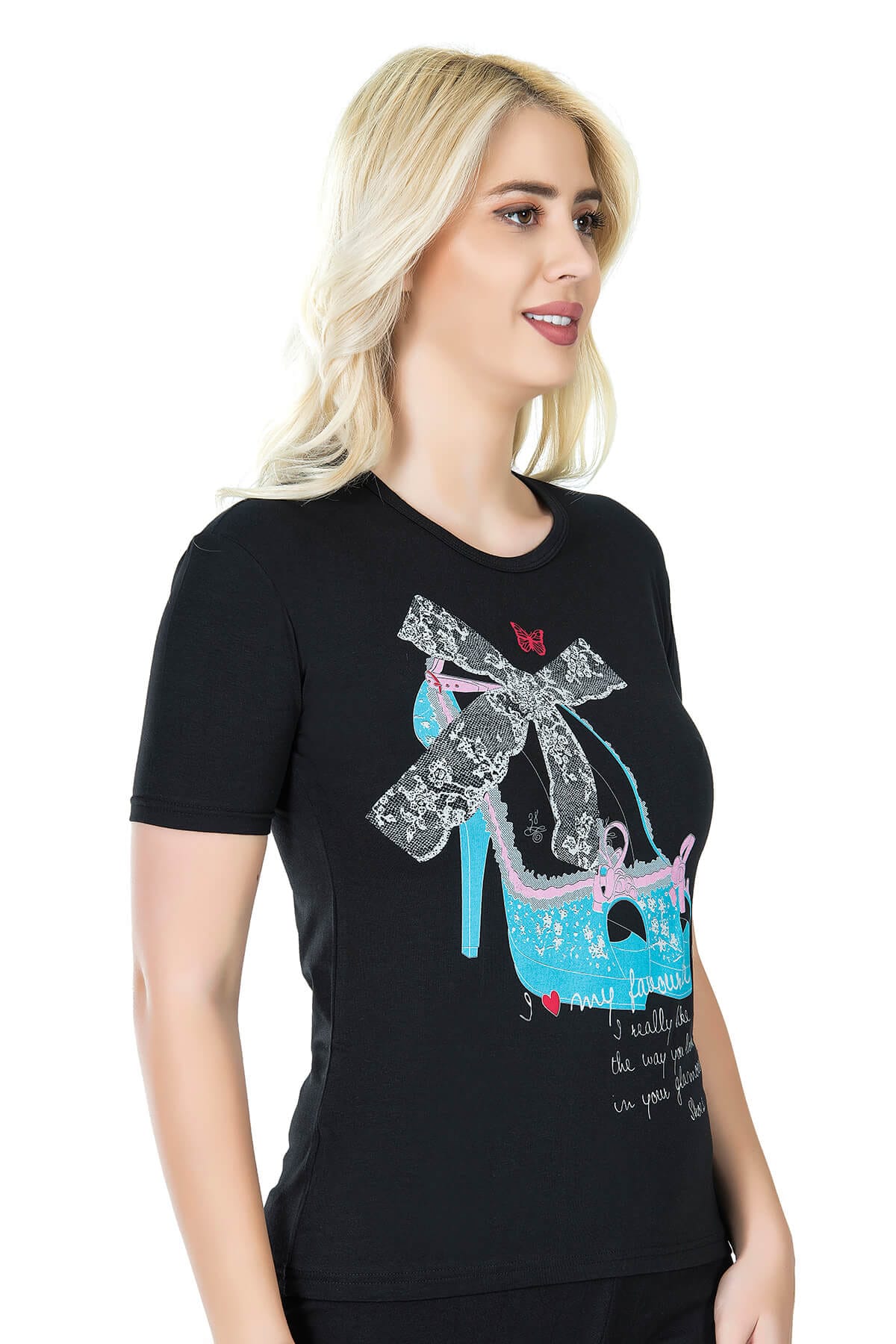 Babet baskılı bisiklet yaka yarım kollu kadın tişört modelidir.
