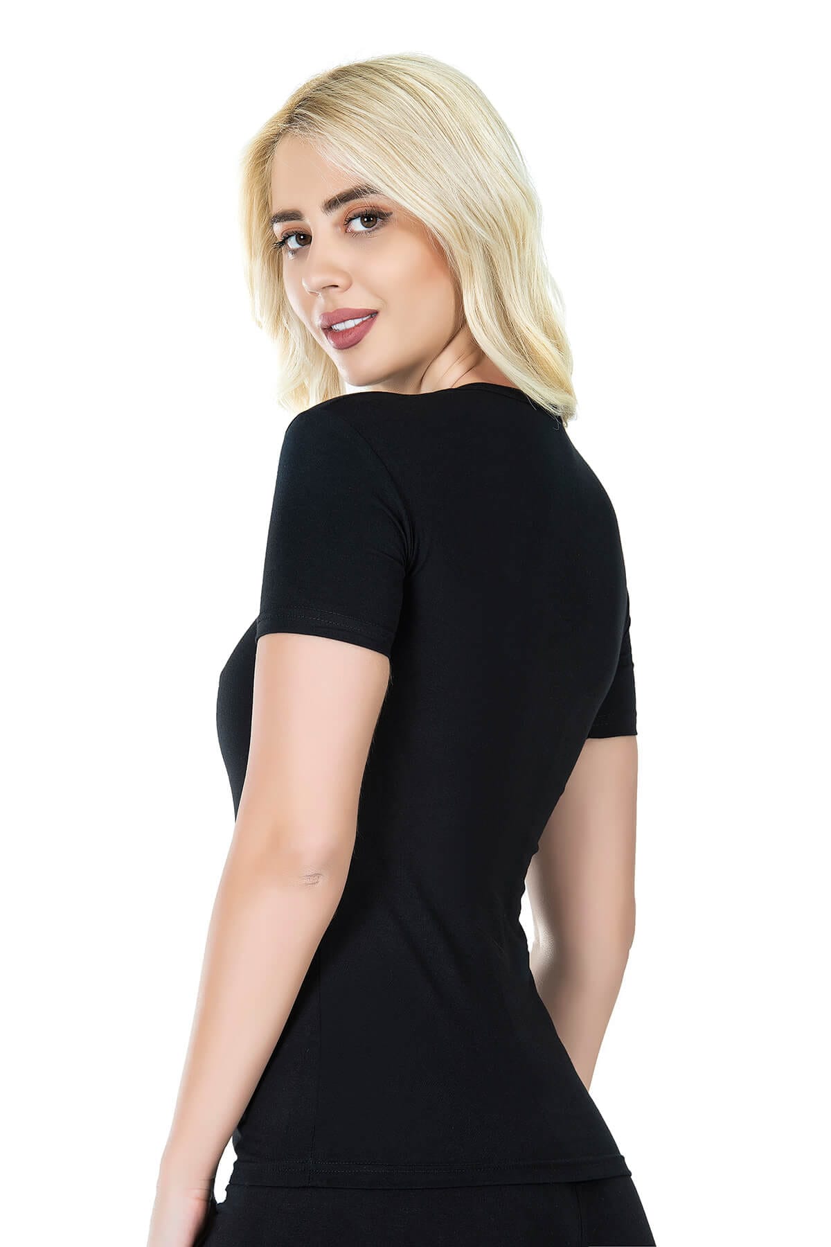 Yarım kollu, V yaka tasarıma sahip yeni sezon likralı kadın tişört modelidir.
