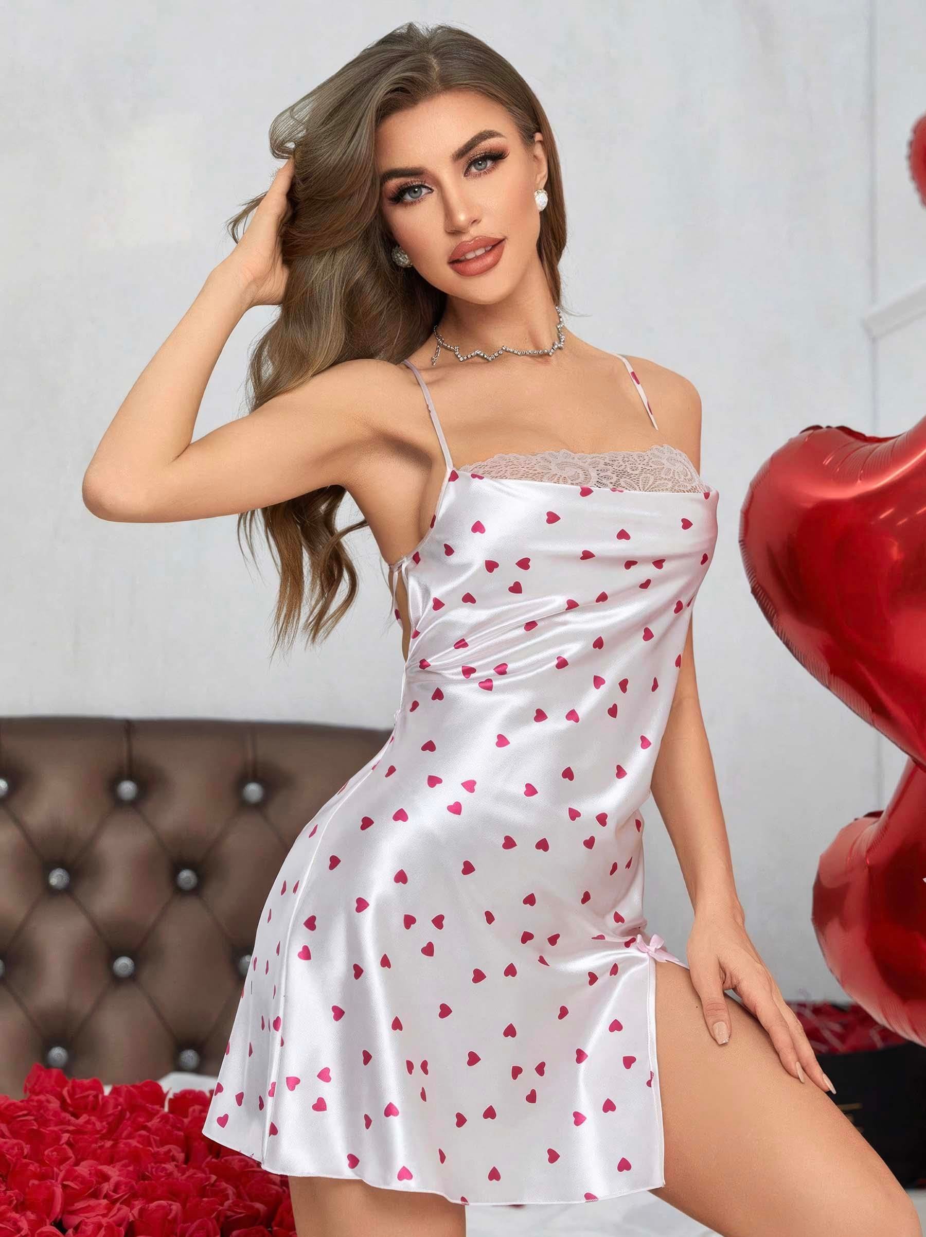 Kadın Beyaz Fuşya Kalp Desenli saten Gecelik 2219